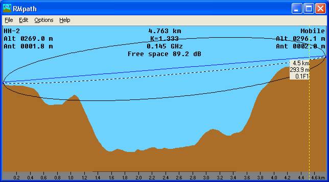 Placing the cursor at an intermediate point on the Radio path, and saving the Large window as above, shows the link details and the type of Land cover at that point in the bottom data region of the window.